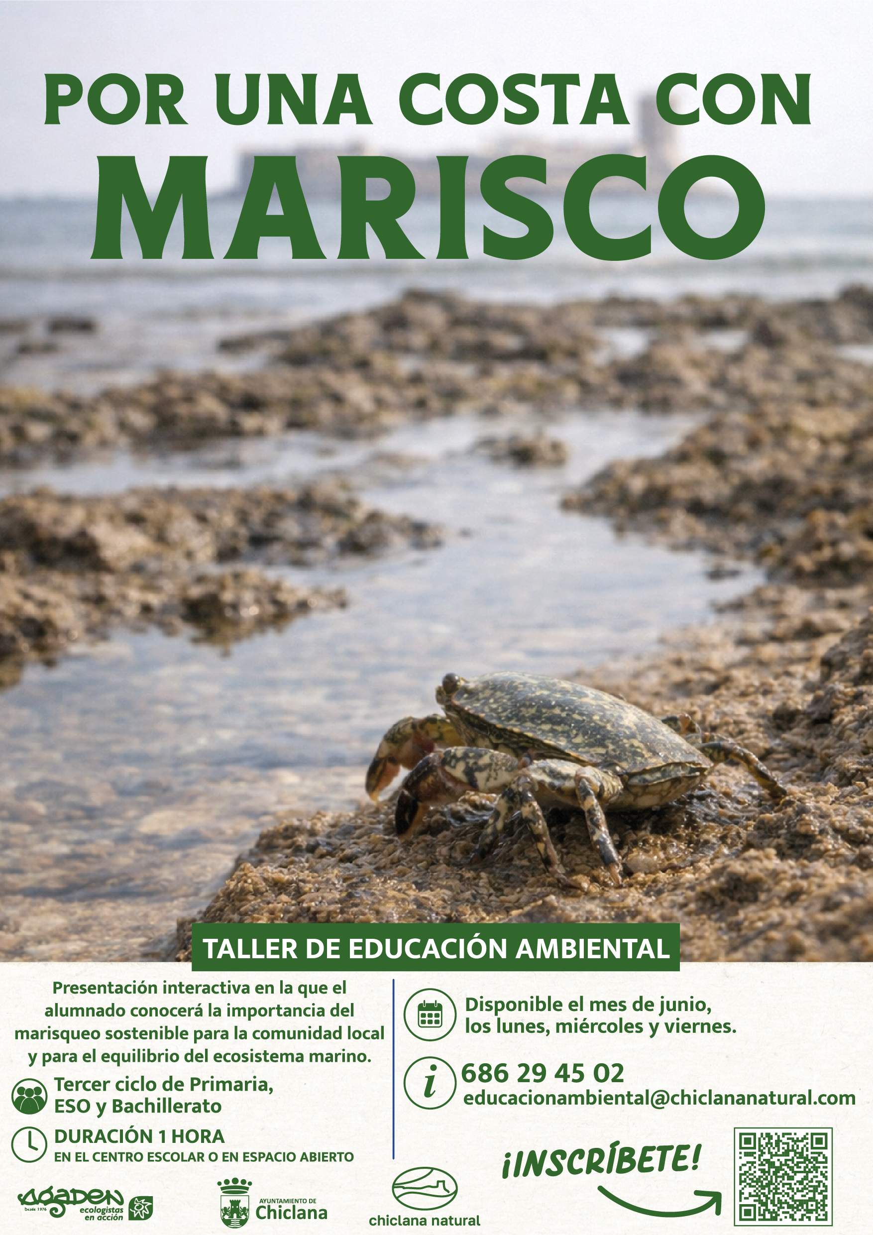Las actividades ofertadas para este período comenzarán el mes de abril con ‘El maravilloso mundo de la abejas’. En este taller se conocerán los diferentes tipos de abejas existentes, así como su ciclo de vida y los beneficios que aportan a los ecosistemas. En mayo continuaremos con un clásico como es ‘Conoce al Chorlitejo Patinegro’ donde el alumnado abordará sus características físicas, ciclos reproductivos y principales amenazas de esta especie que puebla nuestro litoral y se encuentra en peligro de extinción. En junio ofreceremos un presentación interactiva en la que el alumnado conocerá la importancia del marisqueo sostenible para la comunidad local y el equilibrio del ecosistema marino con ‘Por una costa con marisco’.